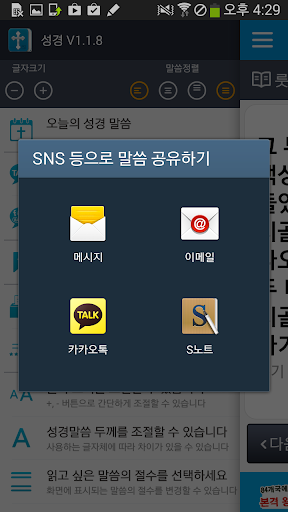 6. 좋은 성경말씀은 카카오톡(카카오스토리), 페이스북, 밴드, 트위터,라인외 모든 SNS를 통하여 바로 올릴 수 있는 말씀 공유기능 이 있습니다.( 물론 메일로 보낼 수도 있습니다. )