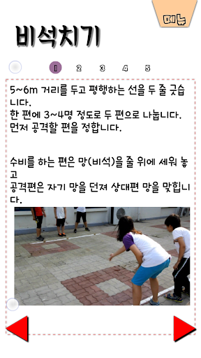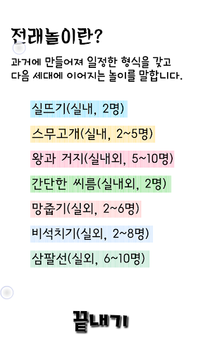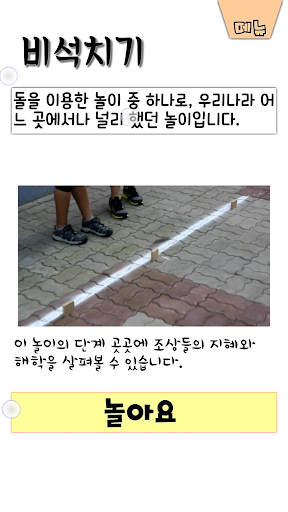 둘이 하는 실뜨기, 스무고개, 왕과 거지, 간단한 씨름, 망줍기, 비석치기, 삼팔선 7개의 전래놀이 방법을 알기 쉽도록 구성하였습니다.