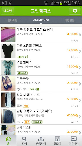 물론 학교 내에서만 거래하고 싶으신 학우들을 위해 계명대 학생들이 올린 아이템만 볼 수 있는 '계명대 아이템'과 '계명인들' 만의 공간도 따로 있습니다.