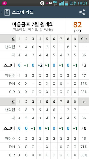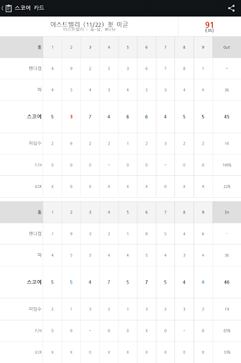 - 간단입력 : 스코어, 퍼팅 수, 페어웨이 히트 여부를 간단한 동작으로 입력 가능합니다.