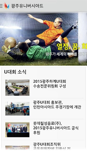 2015년 07월 03일~ 07월 14일 (12일간) 광주에서 개최하는 광주 유니버시아드경기의 다양한 경기 종목들의 정보와 경기일정, 경기장소, 해당 어플로 다양한 정보를 신속하고 정확하게 볼 수 있으며. 대회기간 동안에 필요한 사람들 중점으로 제작된 어플리케이션입니다.