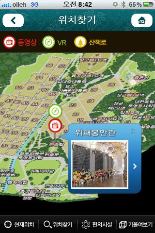 GPS를 이용한 증강현실 기능을 통해 주요 묘역, 시설물에 대한 사용자 현재 위치 기준 거리를 안내, 국립서울현충원 지도위에 나의 현재위치, 동영상/VR등이 지원되는 묘역 및 시설물 안내, 편의시설 및 산책길 안내 등 서비스