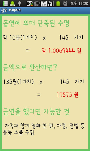 건강체크 : 자신의 흡연량으로 줄어든 수명 및 금액으로 환산한 결과를 보여준다.