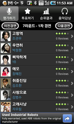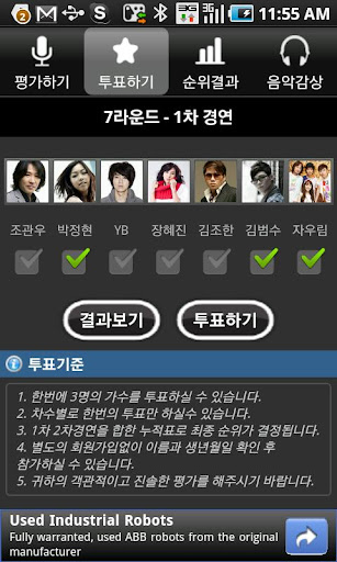본 애플리케이션은 MBC 방송국 “나는 가수다에서 진행하는 실제 청중평가단의 투표방식을 그대로 적용한 나는가수다(스마트평가단)” 애플리케이션 입니다.