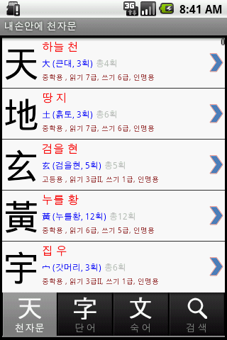 ★총데이터량은 천자문과 단어1000자이상 천자문숙어 250자 내외,천자문에 뜻풀이에 포함된 단어1000자이상등. 이 어플 하나로 충분히 천자문이외에도 실생활 한자에 응용하실수 있게 구성되어있습니다.