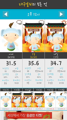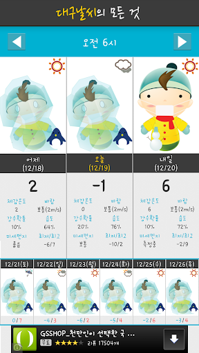 시간대별로 한눈에 비교할 수 있습니다. 귀여운 캐릭터가 알려주는 날씨정보!