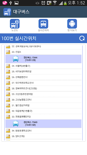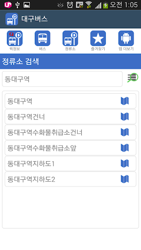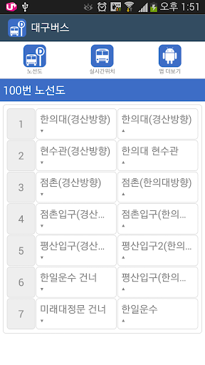 노선, 정류소 등의 정보는 대구버스정보시스템과 인터페이스 하므로 앱(데이타) 업데이트 없이 정보를 제공합니다.