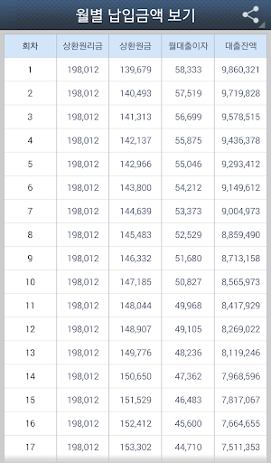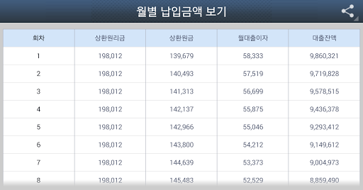 대출 및 캐피탈 할부 이자 계산을 월별 납부 내역을 확인할 수 있습니다.