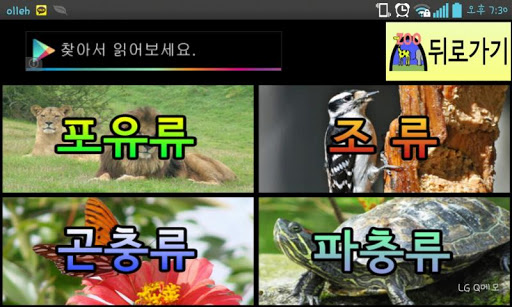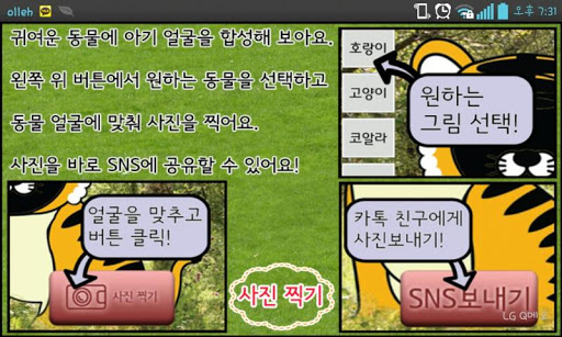 직접 동물원을 가지 않고도 집에서 쉽게 동물을 만날 수 있는 교육용 앱입니다. 동물을 누르면 동물 울음소리가 나고, 동물 이름을 누르면 성우가 한글을 읽어줍니다. 아이 얼굴을 동물 캐릭터와 합성하여 사진을 찍고, 공유할 수 있습니다.