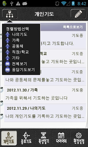 나 / 가족 / 공동체 / 직장 및 학교 / 기타 등으로 기도제목을 기록하고 관리