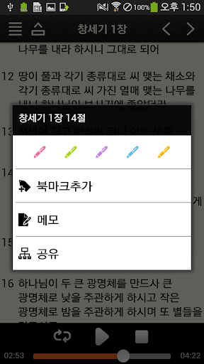 - 하이라이트 : 5가지 색깔이 지원되며 절단위로 하이라이트 할 수 있습니다.