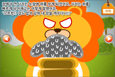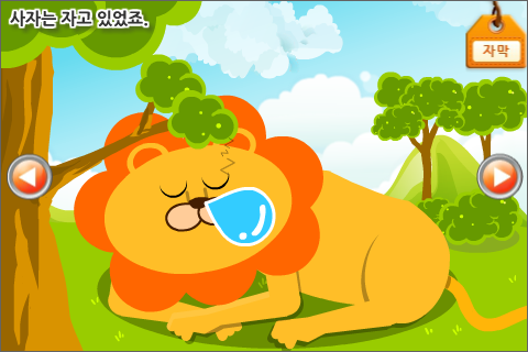 루미키즈 앱북 사자와쥐는 기존의 플레이 방식의 보기만 하는 동화가 아닌 아이들이 직접 스토리 진행에 참여하도록 유도 하는 인터렉티브 동화 어플리케이션 입니다.