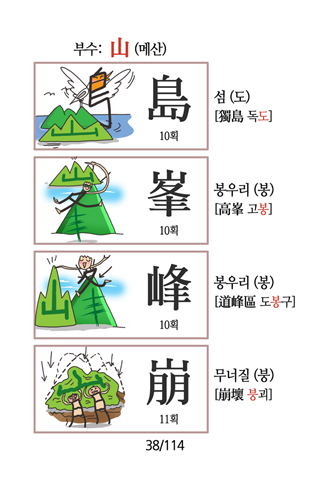 부수별로 구성하여 부수의 쓰임새를 몸으로 익히게 되고 한페이지에 4개의 한자로 구성- 같은 부수의 한자를 비교하게 되어 한자가 만들어진 원리를 터득하게 됨.