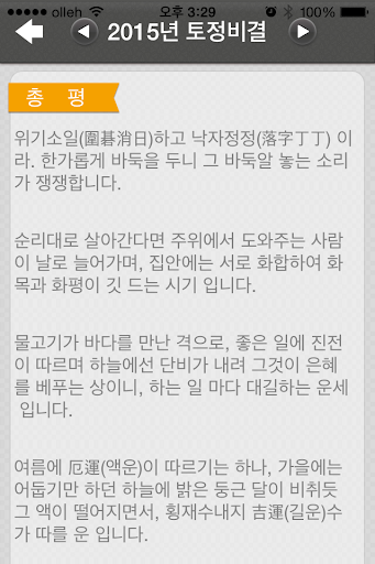 2015년은 물론 과거, 미래의 토정비결을 토탈 서비스로 제공하며, 총평/현대적풀이/월별운세 등의 방대한 분량의 내용이 제공되는 명품 토정비결
