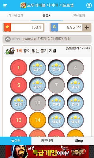 - 하루 한번 룰렛을 통해 별 또는 게임권 지급