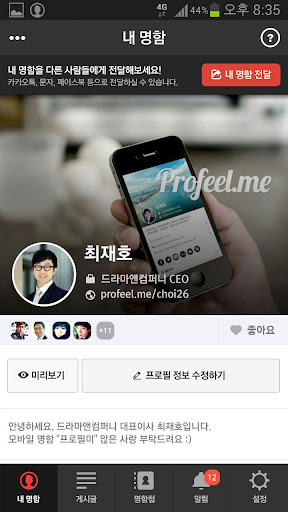 프로필미는 쉽고 간편하게 모바일 명함을 만들고, 전달하고, 보관할 수 있는 애플리케이션입니다.