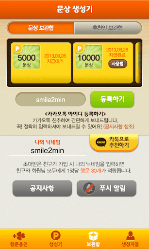 묻지도 따지지도 않고 50명 추천을 가장 먼저 달성한 100명에게 5,000원권 문화상품권 무조건 지급!! (자세한 내용은 어플 내 추천왕 이벤트 참조)