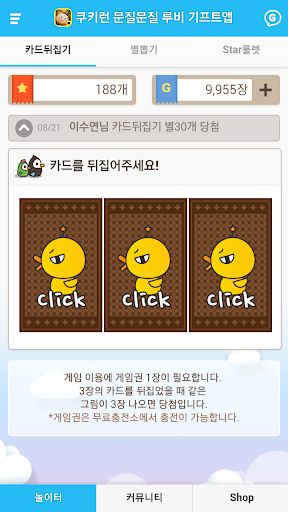 무료 이벤트 참여 및 재미있는 놀이터 게임을 통해 당첨된 별을 쿠키런 문질문질루비로 교환하시면 됩니다
