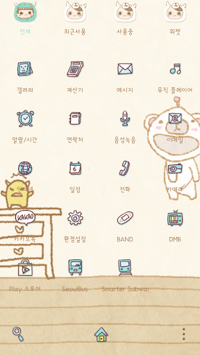 - 홈화면을 위로 쓸어올리는 제스쳐로 런처메뉴를 꺼내, [테마] 메뉴 선택, 원하는 테마를 선택하여 적용