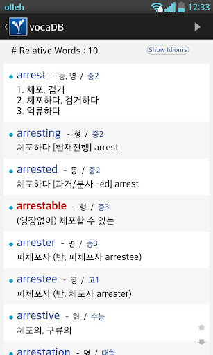 5. 검색 단어와 연관된 품사, 유사어, 반대어 등 연관어 자동 검색과 검색어를 사용한 이디움 및 구동사 검색 서비스
