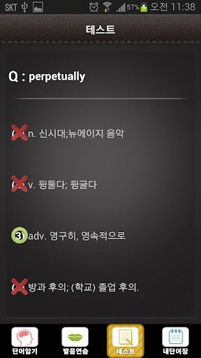 학습한 단어들에 대한 테스트 기능을 제공합니다. 단어 또는 뜻을 보고 4가지의 보기 중에 정답을 선택하는 방식입니다.