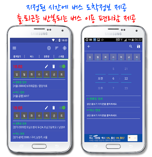 - 지정한 요일과 시간에 도착정보를 자동으로 알립니다.