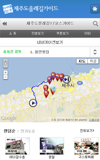 제주도 올레길 지도 보기 , 쿠폰, 검색, 업체별보기 와 실시간검색 1위~10순위 제공등을 한눈에 볼 수 있습니다.