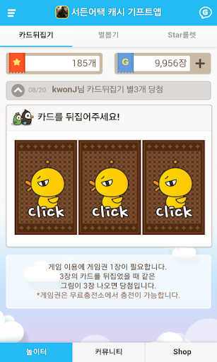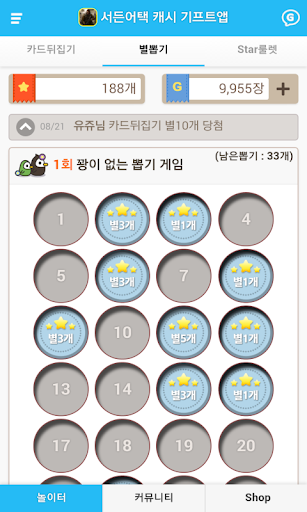 - 하루 한번 룰렛을 통해 별 또는 게임권 지급