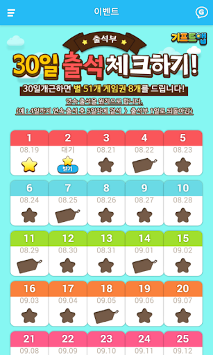 - 3~4일 연속 출석시 별 대신 게임권(별10개 해당) 1장 지급