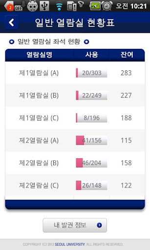 - 도서관 자율학습시설(열람실, 스터디룸, PC좌석) 별 좌석 이용 현황 확인