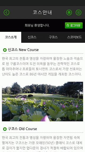 86년 아시안게임을 치뤘던 신코스는 국제대회를 개최하는데 조금도 손색이 없는 좋은 코스로 자연의 입지조건을 그대로 살려 구릉지를 이용하여서 플레이를 하는데 싫증을 감각으로 느낄 수 없는 것이 특징입니다.