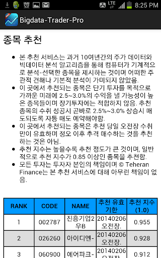 BigData Trader Pro는 BigData Trader의 유료 버전으로, 무료 버전에 비해 [종목 추천] 서비스와 [종목별 종합 분석][테마주분석] 서비스가 추가되었고, 상세한 Auto Trading 시뮬레이션 결과를 제공합니다.