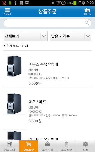 상품주문, 주문조회 , 수요설문, 공지사항 기능
