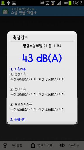 안녕하세요. 주거문화개선연구소의 소음민원해결사입니다. 층간소음이나 화장실 급배수 소음 등 실생활에 주로 발생하는 소음들을 간편하게 측정해보세요. 측정값은 문자나 이메일로 저희 연구소로 보내주시고 상담이 필요하신 분은 측정값을 연구소로 보내신 뒤 하루 뒤에 전화주세요.