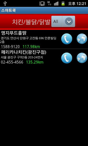 1.스마트쿡 앱은 GPS위치기반 서비스를 통하여 현재 검색하는 위치에서 가장 가까운 거리 순으로 검색정보를 알려드리고 1KM ~ 100KM까지 차등적인 검색 정보를 제공한다.