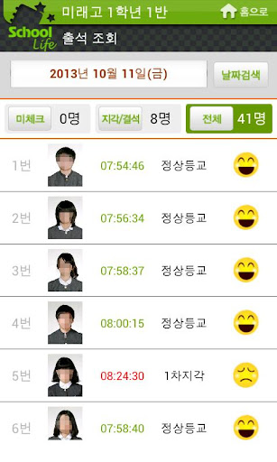 *출석조회 : 담임선생님은 학반별 출석검색을 통해 반학생의 출석내역을 정확히 확인 할 수 있으며, 학생별 출석검색도 가능 합니다.
