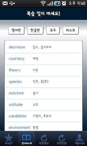 순간 인식 암기법은 자신도 모르는 사이에 단어가 자동으로 암기 될 것입니다. 그 날의 단어를 단어리스트를 이용하여 복습하면, 효과는 배가 될 것입니다.