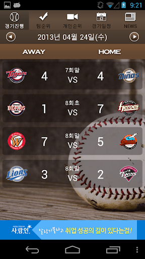 Keywords : 2014, Korean, pro, baseball, 문자중계, score, widget, news, RSS, player, rank, ranking, mobile sports, schedule, all star, WBC, World Baseball Classic, 광고, 한국, 프로, 프로야구, 시범경기, 스코어, 위젯, 야구소식, 야구이야기, 야구 카툰, 야구 정보, 경기결과, 경기일정, 선수정보, 선수명단, 선수리스트, 일정확인, 스케쥴, 스케쥴 정보, 팀 순위, 야구 중계, 모바일 스포츠, 득점, 실시간, 점수, 랭킹, 가을 야구, 올스타전, 방송, 응원, 응원, 라디오, 라디오 중계, 롯데 자이언츠, 기아 타이거즈, 엘지 트윈스, 두산 베어스, 삼성 라이온즈, 넥센 히어로즈, 한화 이글스, 에스케이 와이번스,엔시 다이노스, 케이티 위즈, NC Dinos, SK Wyverns, Hanhwa Eagles, Nexen Heroes, Samsung Lions, Doosan Bears, LG Twins, KIA Tigers, Lotte Giants, KT Wiz