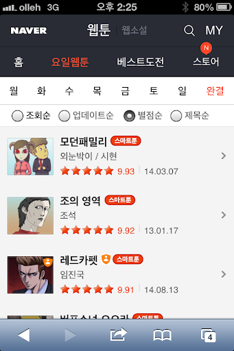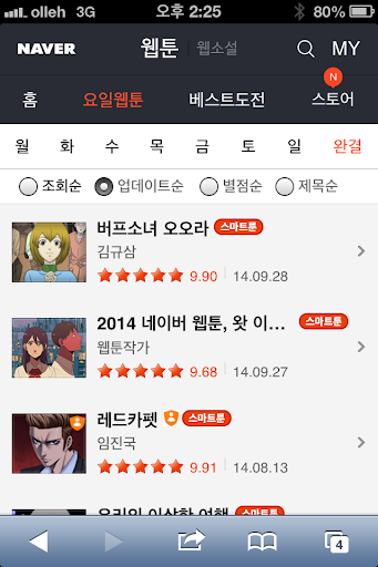 네이버 만화 업데이트순, 조회순 벌점순, 제목순 으로 최신판 완결 웹툰을 무료구독