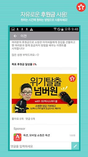 - 후원하기 메뉴에서 광고를 이용하면 광고 별 책정된 금액이 100% 해당 스타의 후원금으로 자동 적립됩니다.
