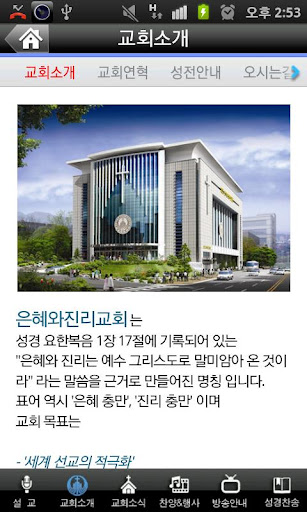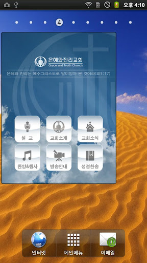 이 어플리케이션은 은혜와진리교회의 모바일 홈페이지와 연동하여 스마트폰에서 모바일 홈페이지의 핵심 컨텐츠를 제공합니다.