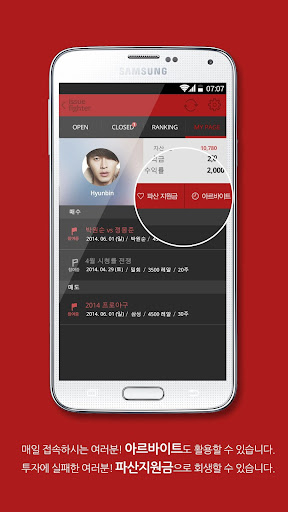 이슈파이터는 진행 중인 시사/경제/스포츠/연예 등의 최근 주요 이슈들을 유저들이 사고 팔면서, 게임의 형태로 진행되도록 개발된 서비스 입니다.