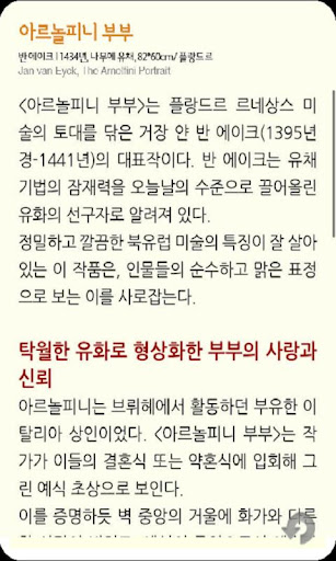 현대인들이라면 누구나 해봤을 고민이다. 책은 귀찮고, 음악도 지겹다면 이제 카드북을 만나자. 카드북이란 말 그대로 여러 장의 카드가 모여 이루어진 신개념 E-book이다. 스마트 폰 화면 크기에 최적화된 카드에 동영상, 컬러 이미지, 글이 담겨 있는 카드북이다. 은 Full color로 된 르네상스 명화들이 담겨 있다.