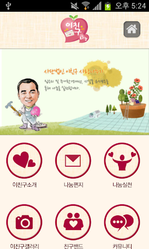 기부하는 것도 좋은 일이지만 내가 가진 능력을 기부하는 것(재능기부) 또한 값진 일이라고 생각하여 젊은 시절부터 건설회사를 경영한 경험을 바탕으로 저소득층 집수리 봉사 급식소 운영등으로 지금은 주변 사람 들이 삶의 질을 바꾸게 하는 사단법인 이친구 사랑나누기를 설립, 운영하고 있습니다.