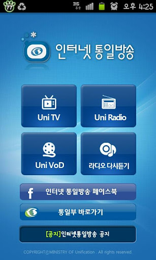 통일부에서 제공하는 ‘인터넷 통일방송’ 어플리케이션입니다.