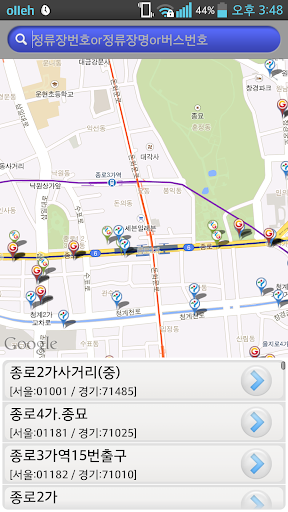 우측에 노선을 터치하므로써 노선 별로 검색이 가능합니다.