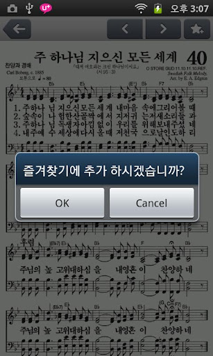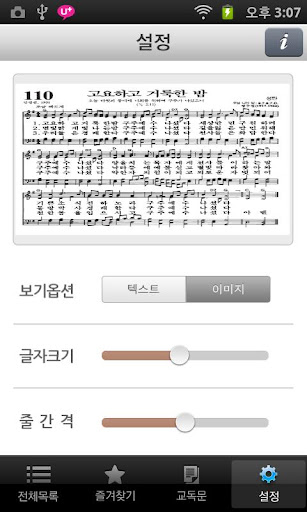 - 악보 보기 또는 가사 보기 선택 가능하며, 가사 보기 설정시 글자크기 및 줄 간격 조절 가능