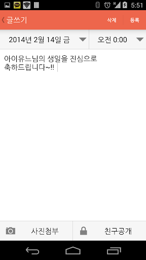 '카스예약글'앱은 2014년2월7일 공개된 카카오API 스펙에 따라, 사진 1장 첨부, 본문 텍스트 입력, 공개값 설정이 가능합니다. (현재 여러장의 사진 첨부, 동영상 첨부, 함께하는 친구 설정은 불가) 카카오 API가 개선될 때마다 신속이 추가 기능을 지원할 것을 약속 드립니다.