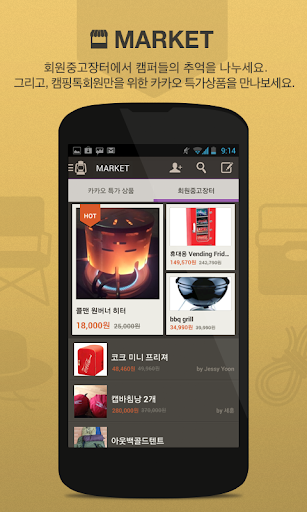 캠핑톡 장터에 가보세요. 캠팔들이 내놓은 저렴한 캠핑용품들과 특가상품들을 바로 둘러보고 거래할 수 있답니다!