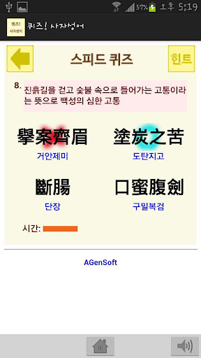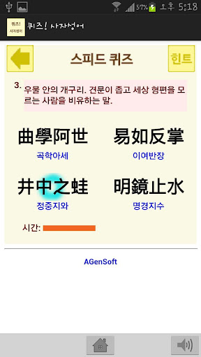 퀴즈를 통해 재미있게 풀면서 자연스럽게 사자성어를 익혀나갈 수 있습니다.